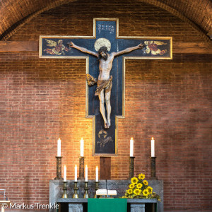 Auf dem Altar steht die Einladung: „Kommt her zu mir alle, die ihr mühselig und beladen seid, ich will euch erquicken.“ Der Altartisch ruht auf zwei Füßen, auf denen Brot (Leib Christi) und Wein (Blut Christi) dargestellt werden. Wie durch ein Wunder wurden Altar und Kreuz durch den Bombenangriff nicht zerstört.