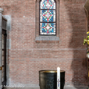 Die Innenwände der Kirche sind mit roten Ziegelsteinen verkleidet. Dazu sind glatt behauene Steinquader als gestalterische Elemente gezielt eingesetzt. Sie bezeichnen die Pfeiler zwischen den Nischen, die Sturzbalken über den Türen, den Rahmen des Nebeneingangs oder die Kanzel.
