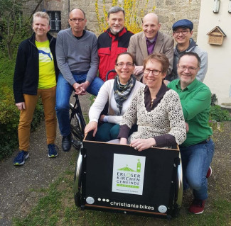 v.l.: Gernot Garbe (Auditor), Hubert Bayer-Münch (Schriftführer), Anette Simojoki (Pfarrerin), Michael Fischer-Hoyer (Umweltteam), Jörg Stahlmann (Kirchenvorstand), Rolf Lang (Umweltbeauftragter), Roland Fuchs (Umweltteam), Andreas Mischke (Kirchenvorstand)